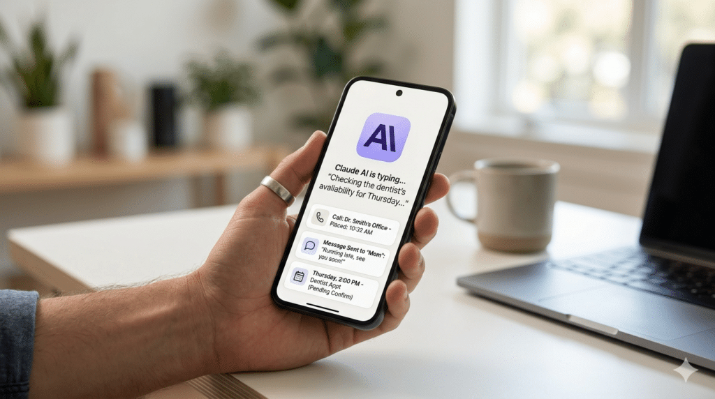 Imagine you’re stuck in a meeting and realize you forgot to call your dentist or reply to an urgent text. Instead of fumbling under the table, you could theoretically tell Claude- Call the dentist and reschedule for Thursday, or Send a message to my team that I’ll be 10 minutes late.